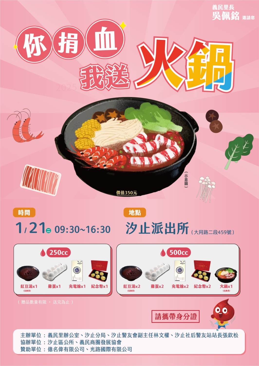 1/21,義民里舉辦「你捐血,我送火鍋」活動 2025 年 1 月 2 日2025 年 5 月 16 日 admin新聞 汐止義民里里長吳佩銘與汐止分局、汐止警友會副主任林文權、汐止社后警友站站長張欽松等,1月21日09:30~16:30在汐止派出所舉辦捐血活動,歡迎大家踴躍做愛心。 追蹤 Google 新聞〡→發佈公益新聞 美國打包台積電?藍委批政府自豪的「台灣模... 雅虎財經 2026-01-16 臺灣證券交易所針對鼎炫投資控股股份有限公... 臺灣證券交易所 2026-01-16 臺美關稅談判總結 確認「對等關稅15%不... 國會串流電子報 2026-01-16 疾管署自115年1月20日起至2月28日... 最新疫情 2026-01-15 【線上收費課程】偉聿老師植物探索線上系列... 原生植物保育協會 2026-01-12 Older posts 地點:汐止派出所 汐止大同路二段459號 看更多訊息:「愛心學苑三福助人園區」上梁 芥菜種會推動跨界助人平台 回應社區脆弱家庭多元需要針對陳奇祿故居庭院被台大砍樹約7棵一案 樹團與當事人回應台大校方1/13對媒體說法希望紅包培力社區媽媽 任性工作室感恩禮拜為弱勢家庭翻轉未來之路磨石坑人文散步 黃姓開稻田 日治茶礦興譴責台大於陳奇祿故居庭院 申請受保至首次會勘期間砍樹約7棵從全民運動到選手備戰 NU SKIN 長期支持台灣體壇 第 15 度榮獲運動部「體育推手獎」肯定妤果生技用行動擁抱南化 讓愛走進700戶家門愛在台灣進行式 傳承創辦人孫理蓮女士服務初心 基督教芥菜種會舉辦感恩禮拜 延續永恆助人事工 4 9 8 9 9 4 Total views : 1635377 Your IP Address : 18.97.14.88 聯絡我們 您的訊息已發送。謝謝! 送出